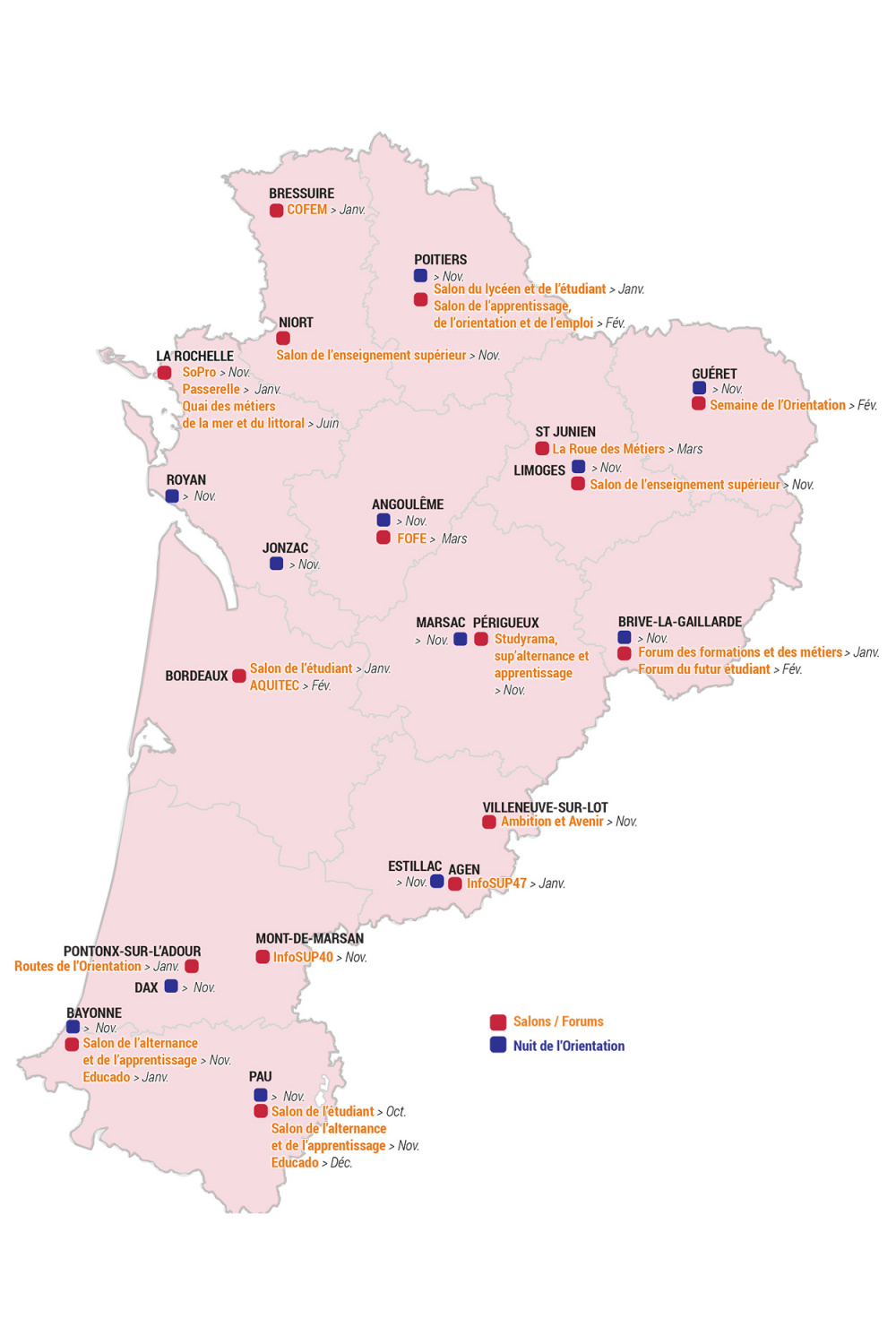 Rendez-vous à Guéret, Pau, Bayonne, Royan, Jonzac, Brive la Gaillarde, Angoulême, Dax, Marsac, Poitiers, Estillac et LimogesDécouvrir toutes les dates et les infos pratiques sur les nuits de l'orientation en Nouvelle-Aquitaine
